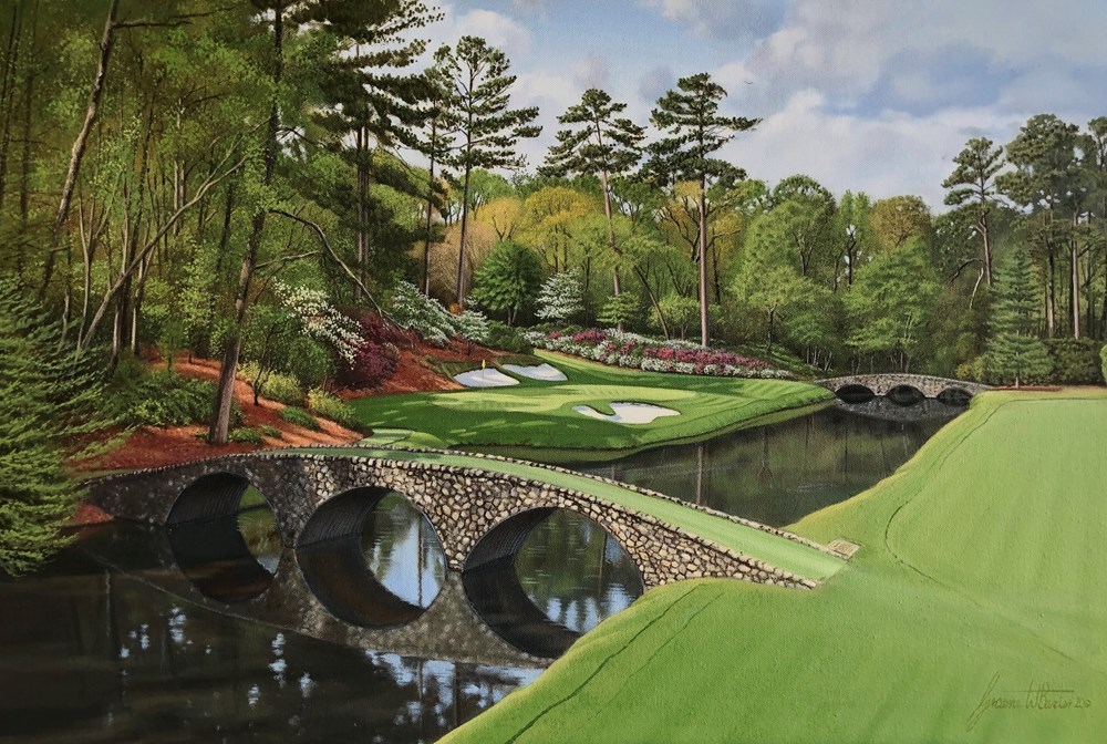 Graeme Baxter, Official Artist to some of the World's most important golf tournaments, such as The Ryder Cup, The Open Championship, The Presidents Cup, The Kraft Nabisco Championship and ANA Inspiration as well as Artist to the PGA Tour and European Tour. With his work displayed in clubhouses at St. Andrews, Augusta, Pebble Beach, Dubai, Mission Hills and Pine Valley in China, Graeme possesses a unique ability to historically record golf landscapes and portraits that capture his passion for the game. Graeme's paintings, giclees (prints produced on Artist Quality Canvas, using pigmented based light fast inks) and lithographs, are displayed in almost 40 countries. The low-volume editions, individual signings and celebrity collaborations add value, prestige and worldwide collect ability to his work. One of the world's most famous golf holes, this is Augusta National's shortest par three. Club selection is often difficult, as varying winds can require anything from a six-iron to a nine-iron for Masters competitors. The daunting presence of Rae's Creek and three strategically placed bunkers make it imperative that players land their shots on the putting surface. Golfers walk across the Ben Hogan Bridge to reach the green. The 12th hole has been a heartbreaker from the start. Its fickle winds, narrow green and looming water have thwarted many runs for the Masters title. Do not miss out on this incredible portrait of such an iconic hole!