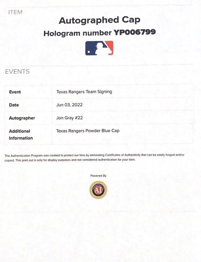 Blue Texas Ranger Baseball cap autographed by Jon Gray. Jonathan Gray is an American professional baseball pitcher for the Texas Rangers of Major League Baseball. He previously played for the Colorado Rockies. Gray played college baseball for Eastern Oklahoma State College and the University of Oklahoma.