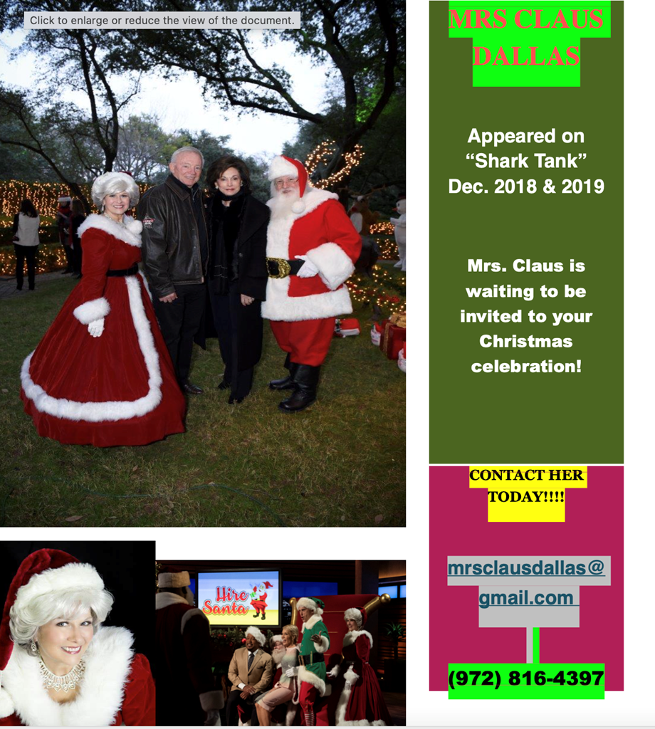 Mrs. Claus will visit your home in the Dallas/Ft. Worth area only. Surprise your little ones with a little Holiday Cheer. Invite "Mrs. Claus Dallas" to provide an Exciting time of Music, Storytelling, Listening to your child's wishes, Dreams and prayers as she TUCKS them Into bed. Included: Small gift per child, Keepsake medallion and a Letter from Mrs. Claus. Mrs. Claus Dallas as been a special guest at Jerry Jones Annual Christmas Party for many years. Mrs. Claus Dallas has been on Shark Tank in 2018 and 2019.
